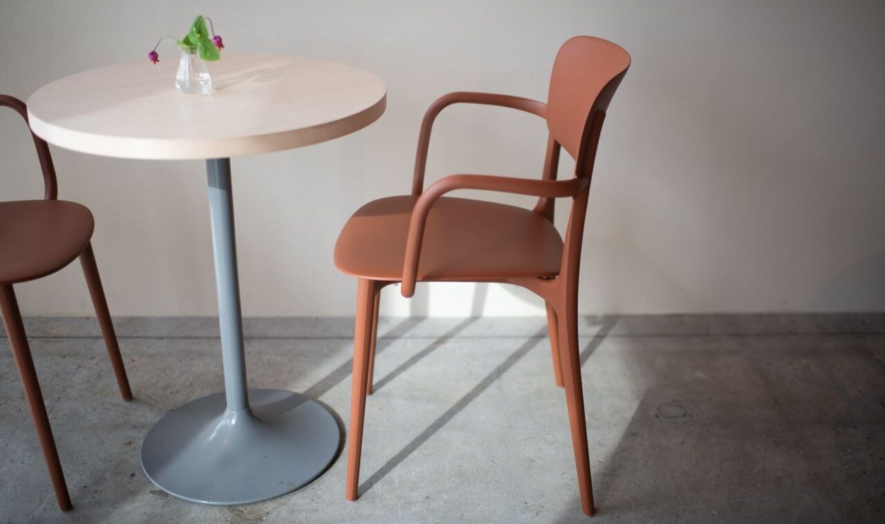 ヨーロッパのクラシックなカフェで使われていた伝統的な椅子をベースに、モダンな材質とスマートなデザインで仕上げたアーム付きスタッキングチェア。軽量かつ屋外使用も可能なため、多様なシーンで気負わずに使うことができます。柔らかなカラーバリエーションも魅力です。